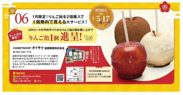 予約サイトからりんご飴を2個購入してくださった方に「りんご飴プレーン1個」をプレゼントいたします♡